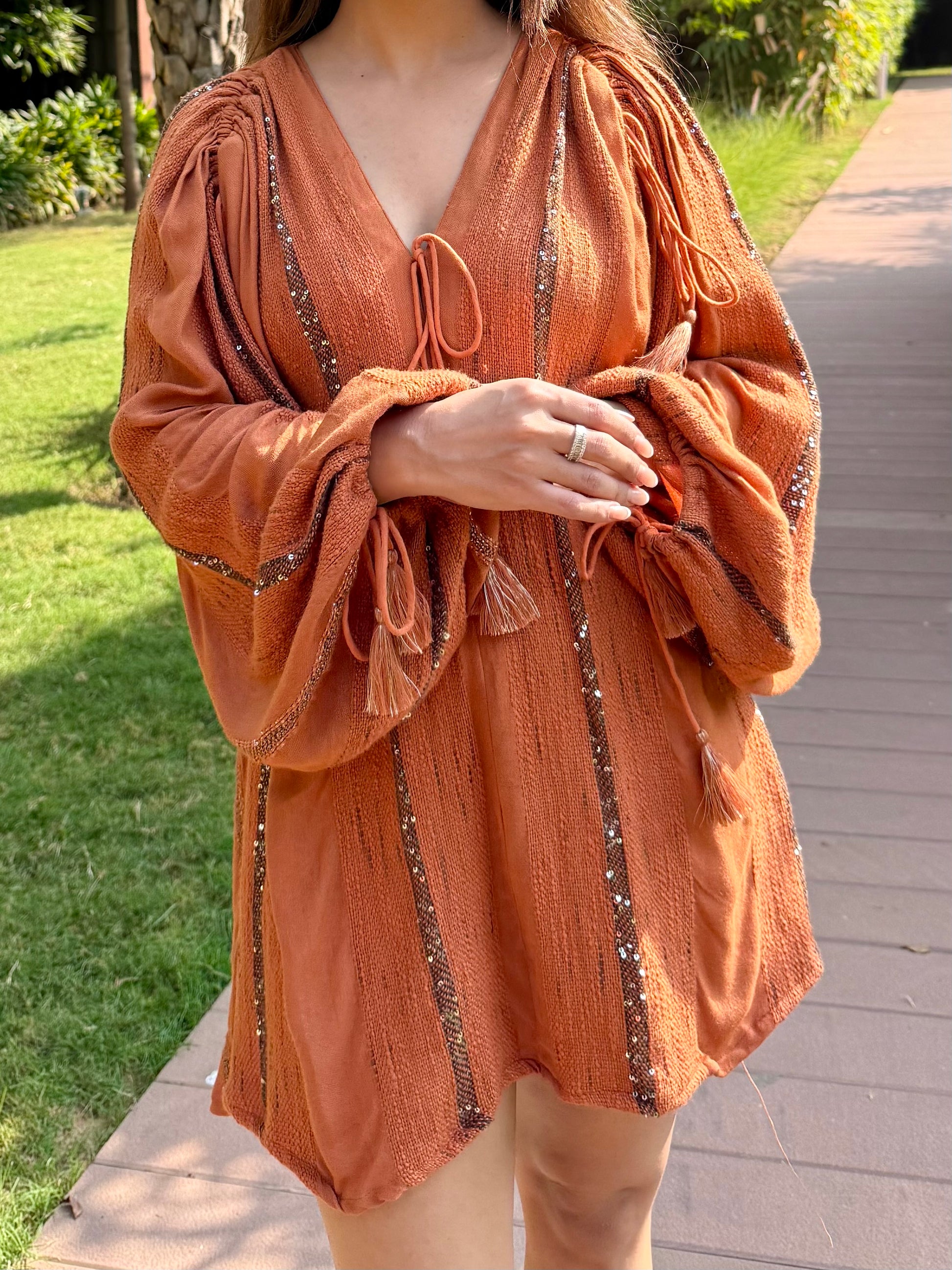 Crafted in soft handloom fabric, the Tessa Dress is your easy statement for vacations and city strolls. Featuring delicate dori detailing along the sleeves and front, and sequin details that add just the right touch of shimmer - it’s equal parts relaxed and refined.