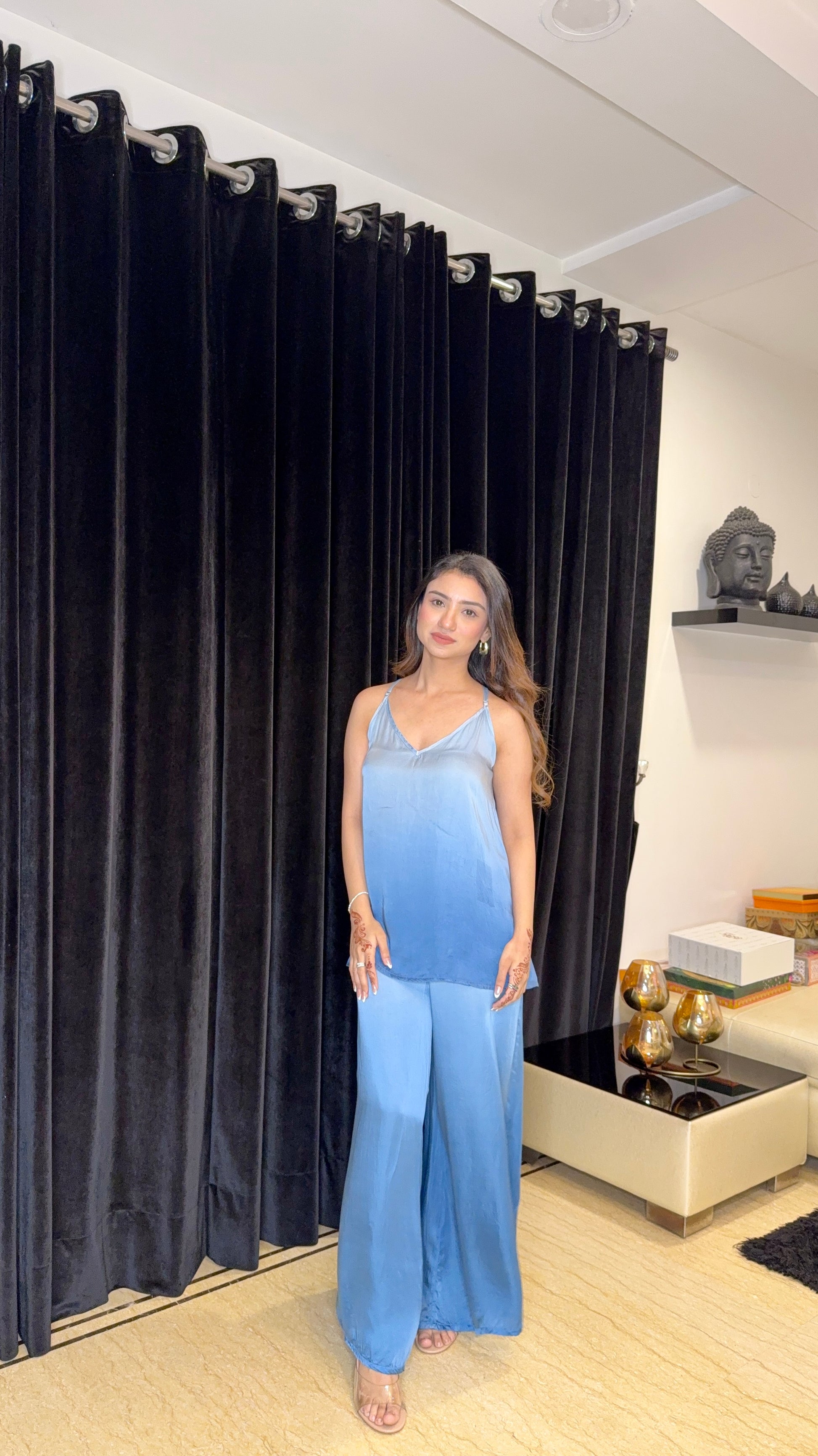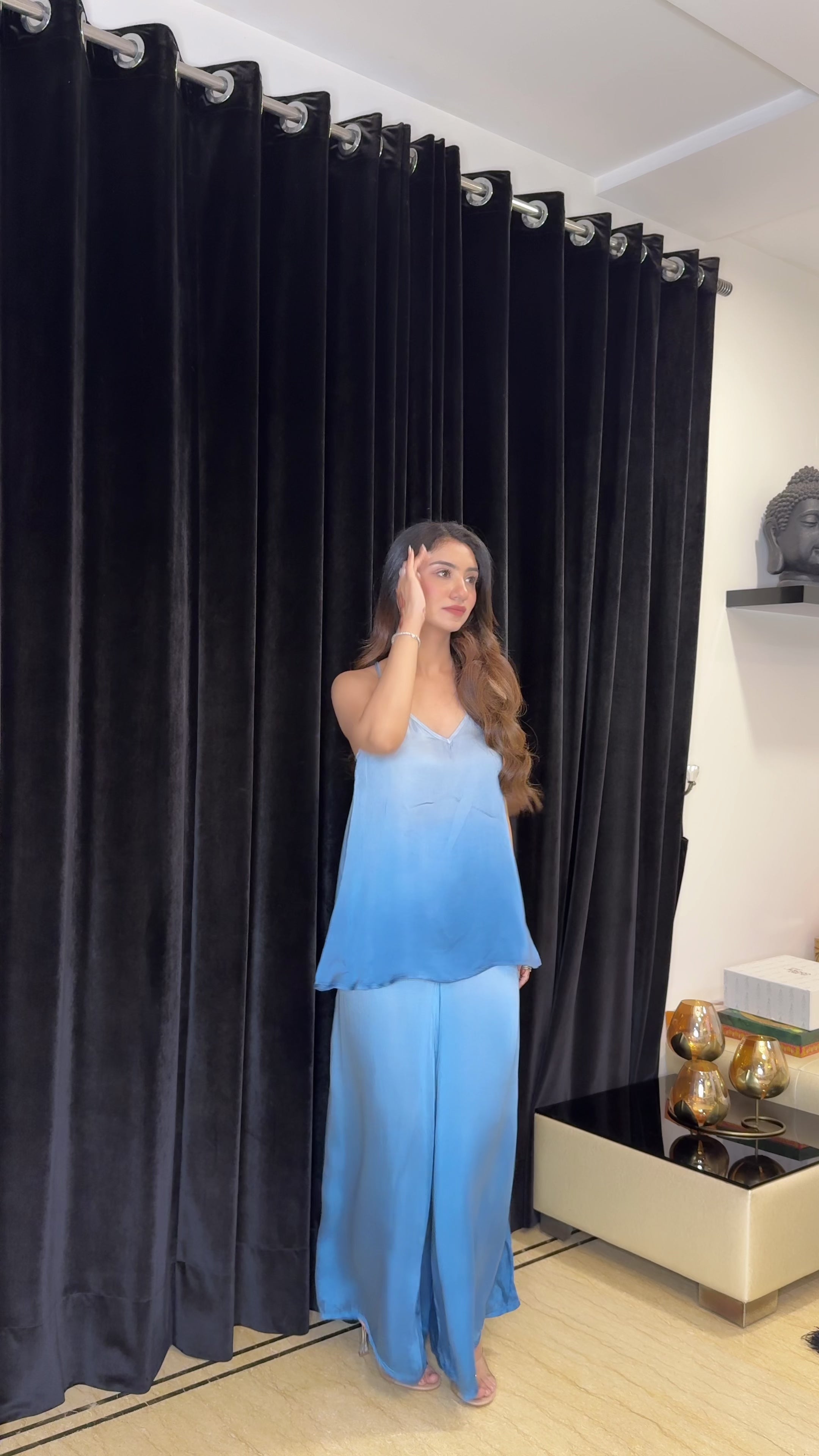 A chic, lightweight satin coord set in a striking blue ombré palette - blending light and deep blue for an elegant, fluid finish. The sleeveless top and flowy pants offer unmatched comfort, making the set perfect for brunches, day plans, or relaxed evening outings. Effortless, soft, and designed to move with you.