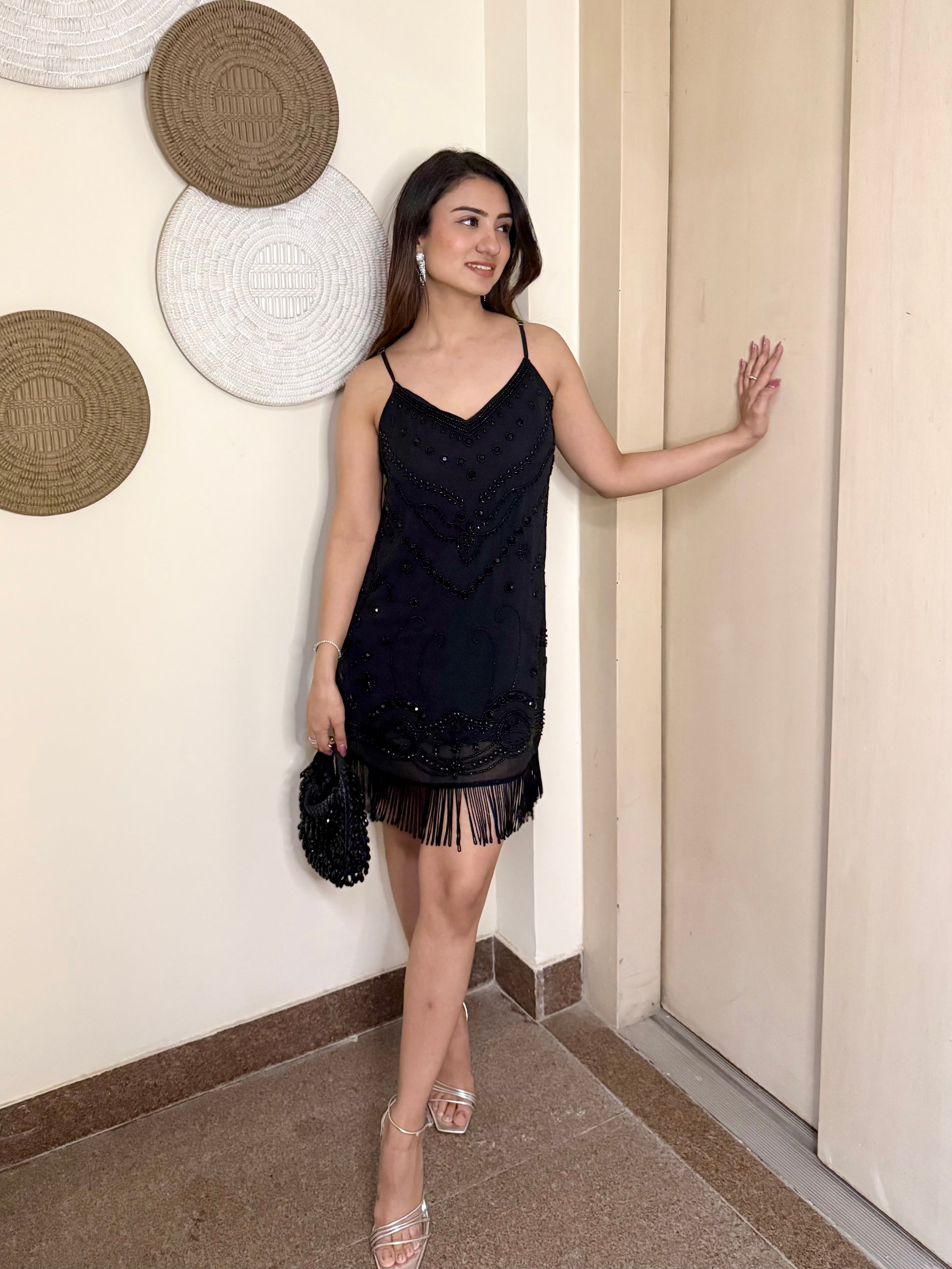 A black mini dress finished with intricate handwork and a playful fringe hem that moves as you do. The perfect pick for nights that call for a little sparkle.