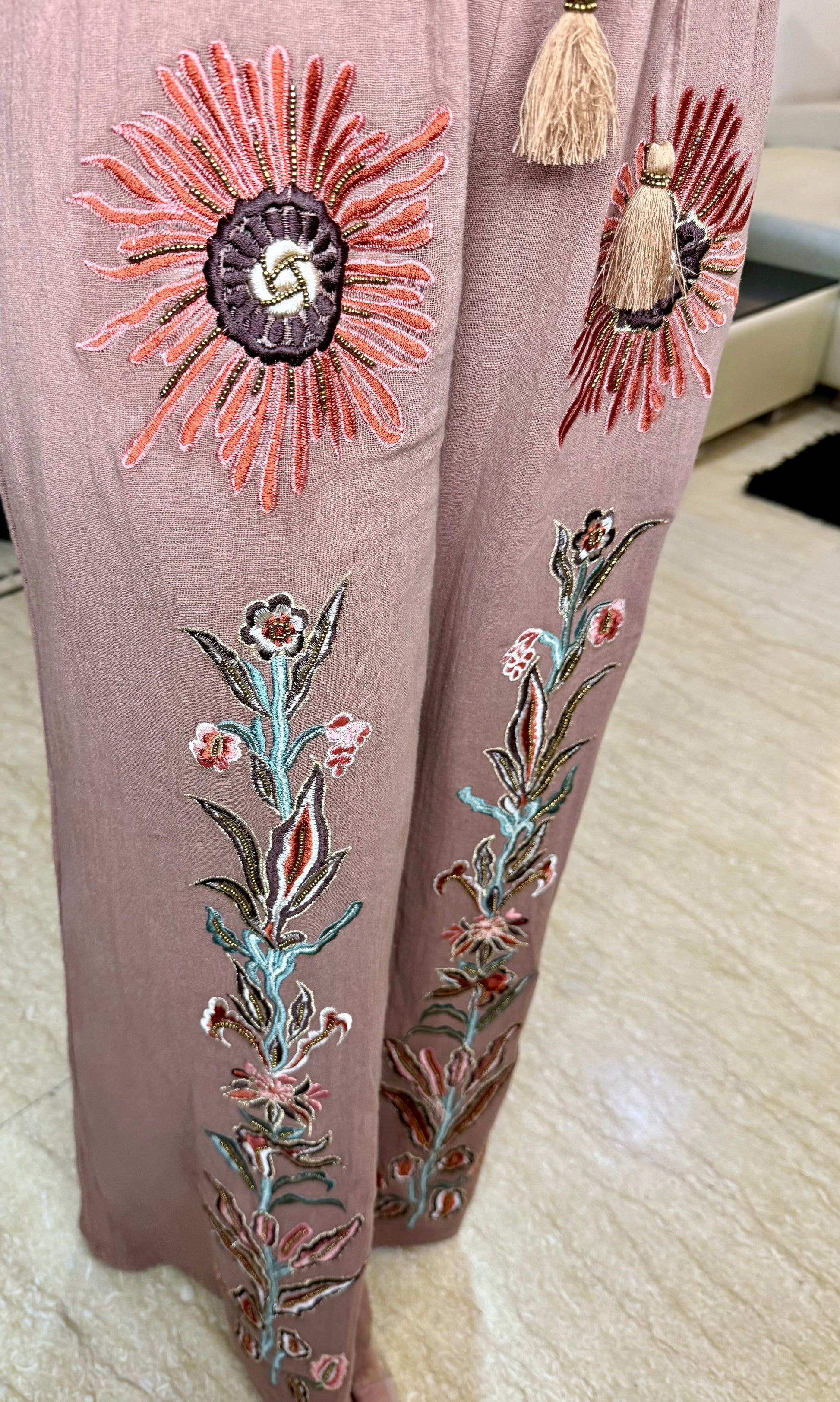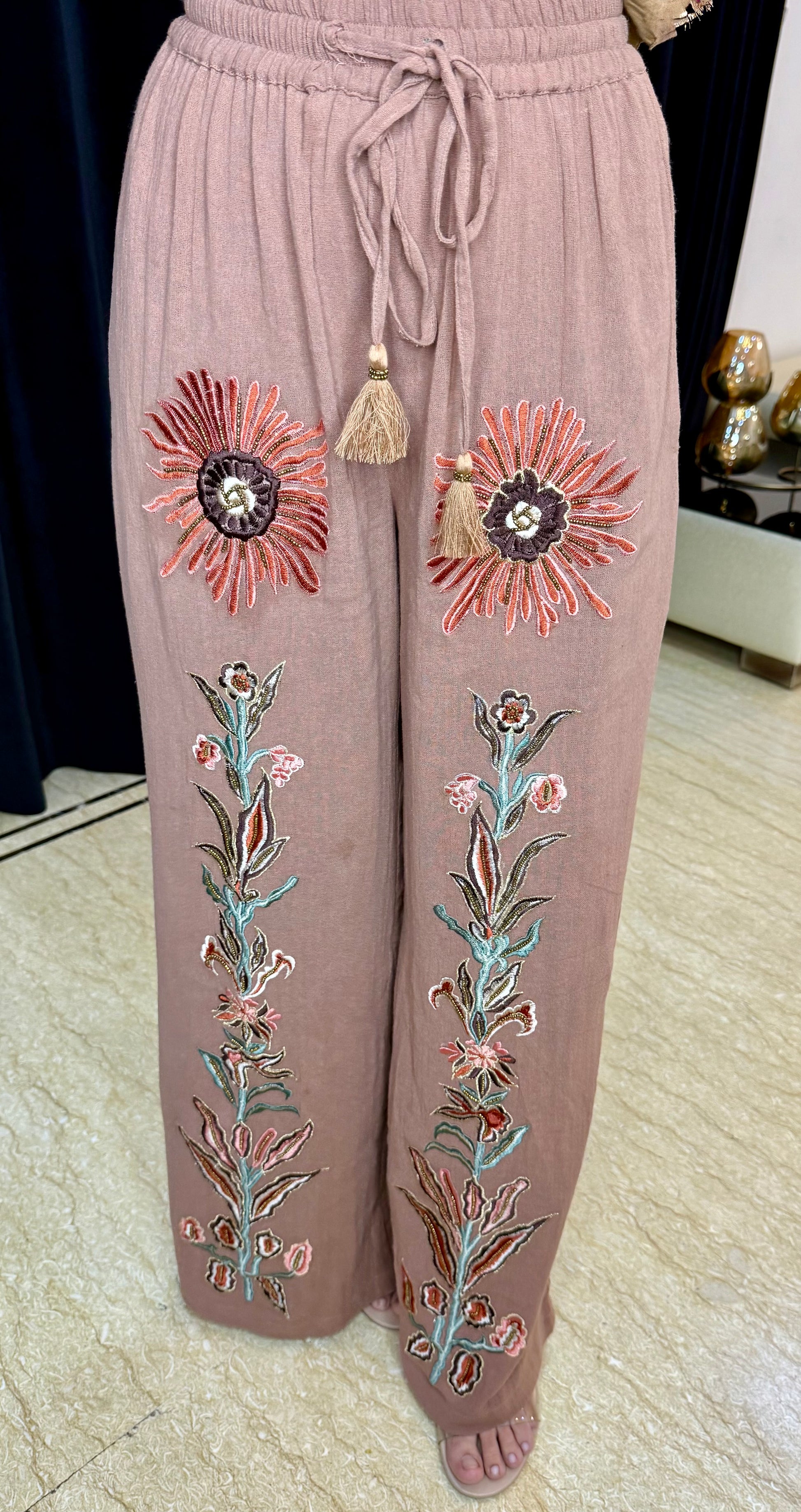 The Amaya pants are adorned with bold embroidered florals and vertical vine motifs that beautifully elongate the silhouette. Comfortable yet statement-making, they are best paired with the Amaya top for a complete look.