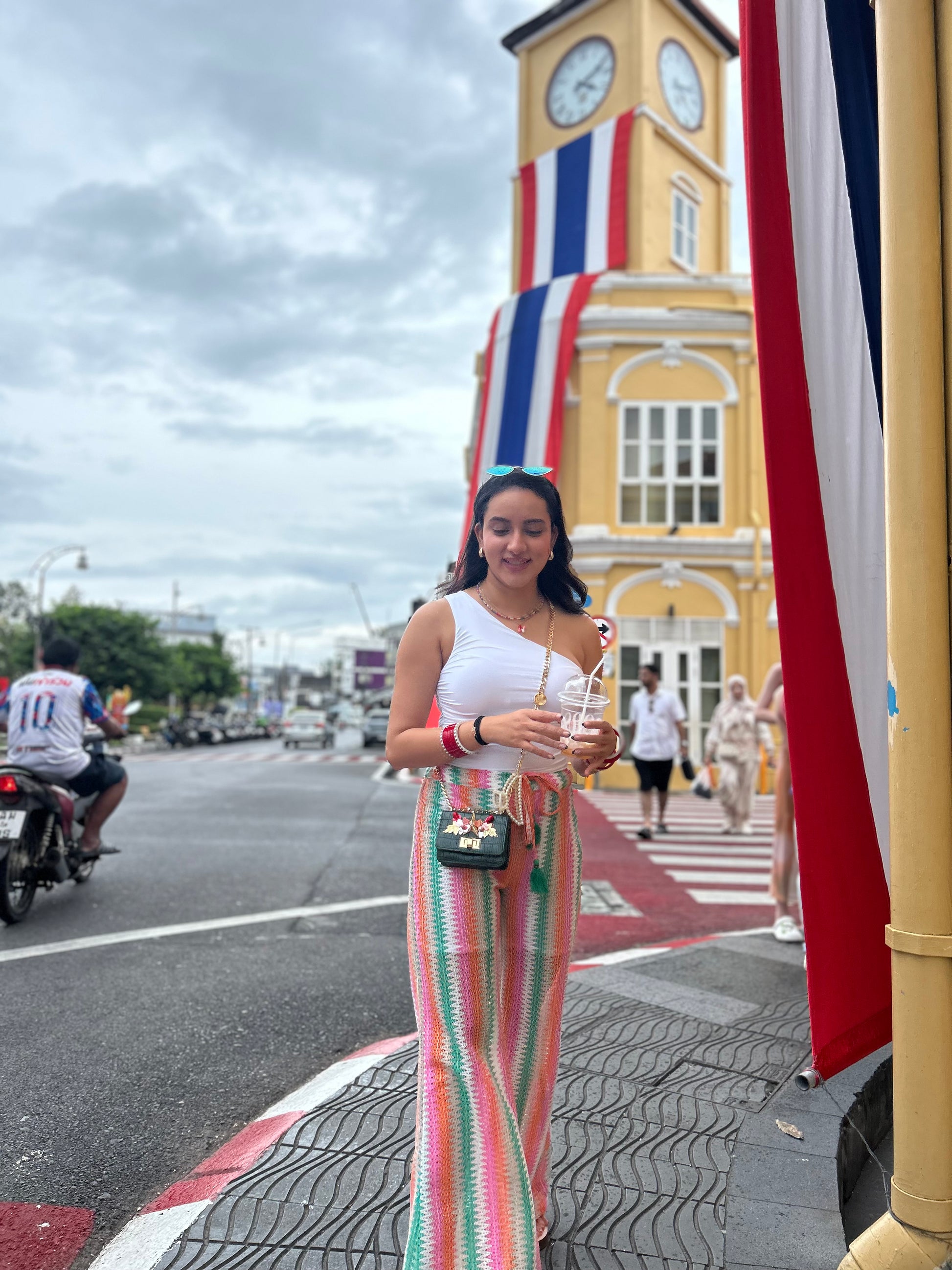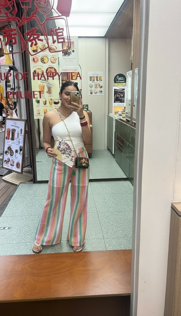 Crafted in vibrant crochet with a mix of bold, playful hues, these pants are a statement piece for carefree days and holiday nights. Lightweight and breathable, they bring comfort without compromising on style. Pair them with a simple top or bikini for a beachside escape, or dress them up for a resort evening.